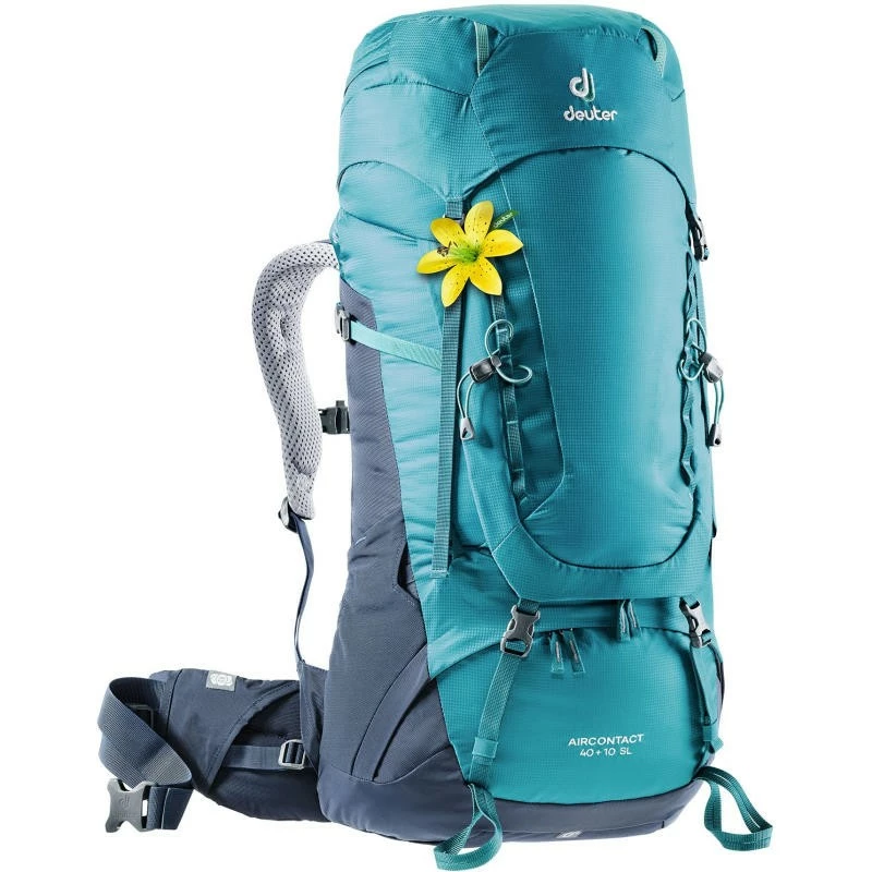 Robuste, confortable et bien équipé, le modèle Deuter Aircontact 40+10 SL a tout ce qu’il faut pour de la randonnée sur tous les terrains et sous tous les climats. Sa couleur turquoise (Petrol Navy) et sa fleur jaune trahissent sa destination : c’est un sac à dos femme. Le confort de portage a été pensé pour les femmes : dos un peu plus court qu’un modèle homme, bretelles plus fines et plus évasées pour dégager la zone de la poitrine et ceinture lombaire avec stabilisateurs qui épousent mieux les hanches féminines. Il s’agit d’un dos Aircontact : le contact avec le dos est optimisé, l’air circule mieux et la transpiration est davantage limitée. La pluie n’est pas un problème : le sac Deuter Aircontact 40+10 SL possède une petite poche contenant une housse pluie Rain Cover. Poids total : 2170 g.