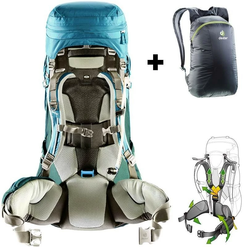 Un grand trajet, les sacs à dos Deuter Aircontact Pro savent faire. Un petit trajet aussi : il y a un sac Daypack caché dans la poche sommitale du rabat. Ainsi, vos petits déplacements à la journée peuvent se faire sans l’ensemble de votre attirail : vous gagnez en légèreté et en mobilité. Un sac Deuter Aircontact Pro 65+15 SL se divise en 8 poches très fonctionnelles : 2 dans la zone centrale du sac, 2 dans les zones latérales, 2 dans la zone sommitale, 1 dans la zone frontale et 1 dans la zone de la ceinture. Une fois toutes ces poches remplies, vous pouvez également attacher une jolie quantité de matériel sur le sac à dos lui-même : des sangles avec boucles rapides et des porte-matériels sont prévus à cet effet. Ainsi, on peut attacher aussi bien des bâtons, une tente ou un matelas de bivouac. Une poche à eau, ce n’est pas de refus : votre sac à dos peut la prendre en charge, il est compatible. Et son poids reste honnête : 3200 grammes.