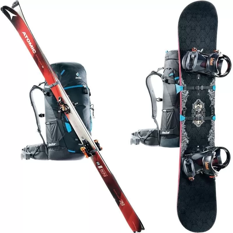 Le Rise 34 est la grande nouveauté parmi les sacs à dos Deuter et on peut dire que c’est une réussite. La polyvalence est poussée à l’extrême en matière de sac à dos parce qu’on a la fois un vrai sac à dos hiver et un vrai sac à dos été. A l’intérieur, on peut charger 34 à 42 litres d’équipements selon le réglage du rabat. L’hiver, on peut accrocher sur le sac toutes sortes de matériel de glisse (planche de snowboard, skis et raquettes à neige). L’été, on peut accrocher sur le sac toutes sortes de matériel de randonnée ou de camping (tente, matelas et duvet). Les emplacements pour les piolets et pour les bâtons de marche sont également prévus. Et inutile de tout détacher si l’on veut accéder à l’espace intérieur : le sac Deuter Rise 34 s’ouvre entièrement par l’arrière et on a accès à tout immédiatement. Le poids du Rise 34 est de 1460 g.