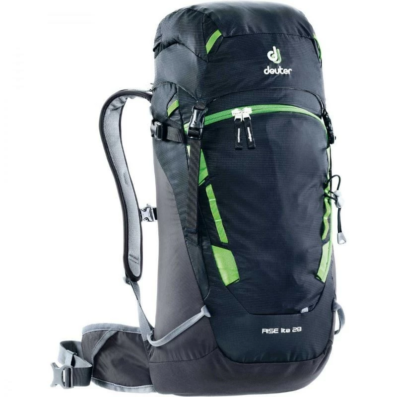 Bien étudié, le sac Rise Lite 28 Deuter comporte 6 poches dont 1 poche fermée avec zip à l’avant, 1 poche ouverte sur le côté droit avec cordon de sécurité, 2 poches fermées avec zip sur le haut du sac, 1 poche fermée avec zip au niveau de la ceinture et la poche principale dans laquelle on retrouve 1 sous-compartiment bien isolé pour les affaires mouillées ou une poche à eau. Déperlant, le sac à dos Rise Lite 28 Deuter ne craint pas les épisodes de neige ou de pluie. Avec son fond doublé, le Rise Lite peut se poser à terre sans crainte.